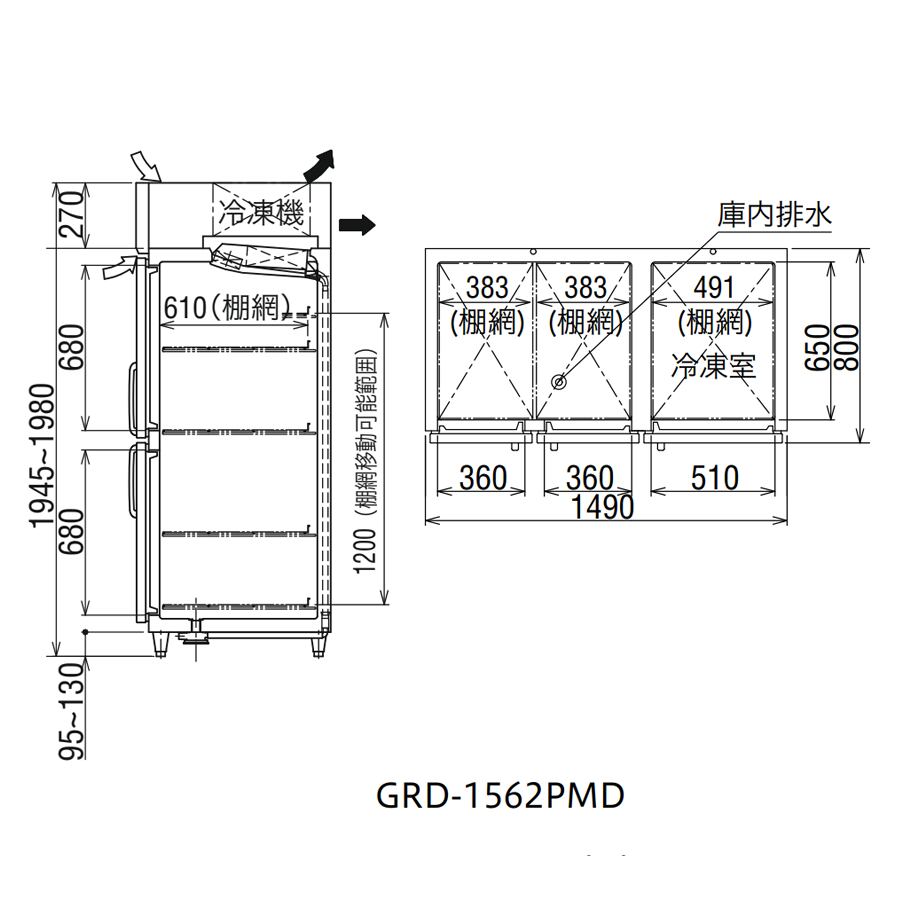タテ型冷凍冷蔵庫【幅1,490/厚型800/冷蔵4室・冷凍2室/6枚扉】フクシマ・GRD-1562PMD