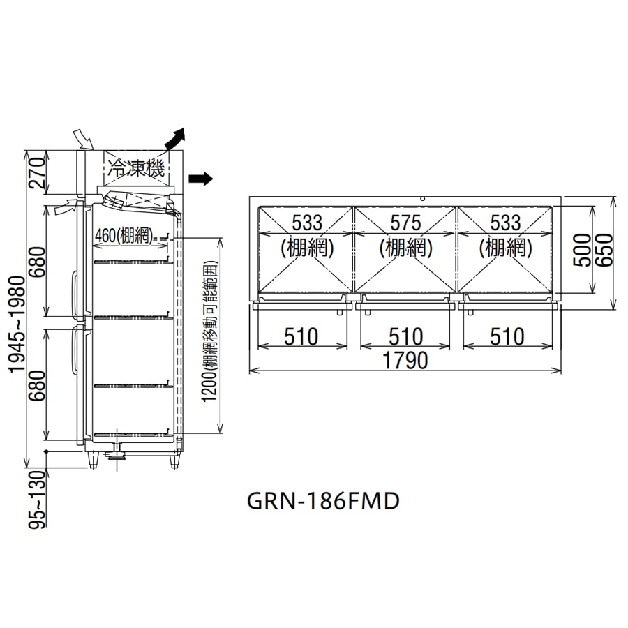 タテ型冷凍庫【幅1,790/薄型650/6枚扉】フクシマ・GRN-186FMD