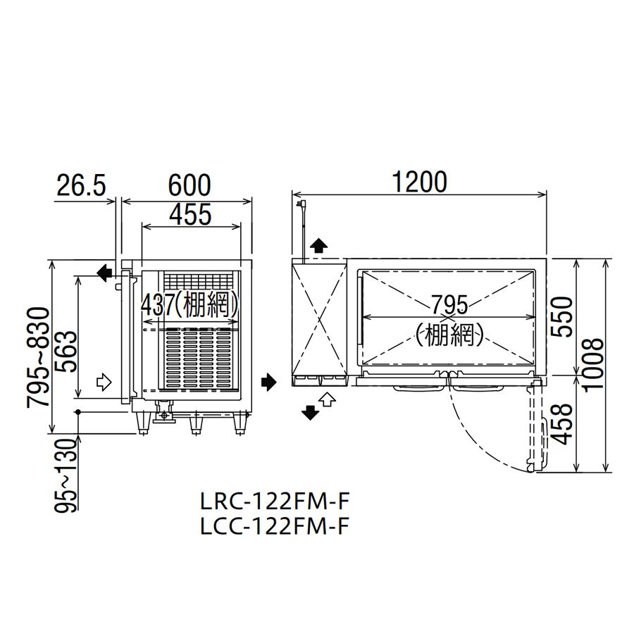 ヨコ型冷凍庫【幅1,200/薄型600/センターフリー】フクシマ・LRC-122FM-F
